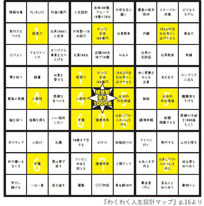 中心には「経営塾塾生1000名」とあり、その周囲に左上から「経営力」「RSHD年商300億円」「20名GRP会社社長にし成功させる」「人間性」「社会的存在価値」「幸運」「健康長寿」「日本に『ドイツ・ティアハイム』をつくる」と記入。それをさらに分解し、それぞれ8つの「必要なもの」を手に入れるための行動を書いている。