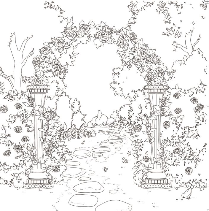 もう一冊、『ぬりえBOOK ことりの気まぐれ花めぐり』はメルヘンな世界観が全開。小鳥が公園や森、街並みや家の中など、色々なところを飛び回る様子が、まるで物語のように展開していきます。タイトルに「花めぐり」とあるように、どの絵にも四季折々の花が出てくるため、花好きの人の心もわしづかみにする一冊です。