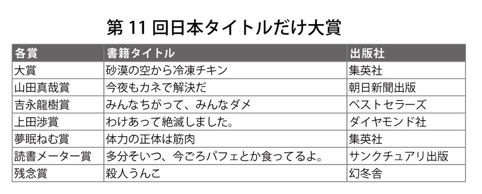 秀逸な本のタイトルを選定し、表彰する「第11回日本タイトルだけ大賞」の選考会が12月9日に開催され、大賞に海外文芸作品の『砂漠の空から冷凍チキン』(デレク・B・ミラー著、加藤洋子翻訳、集英社刊)が選ばれた。