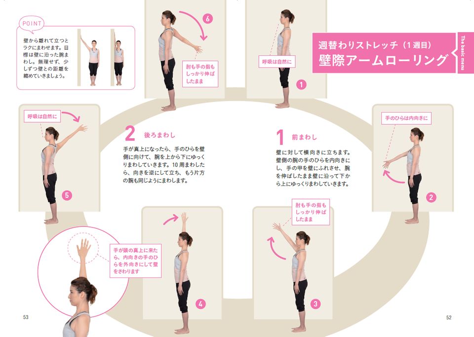 2、壁側の手の甲を壁につけたまま、前まわしに腕を上げる。