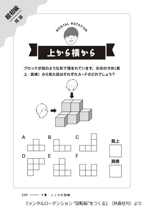 「こころの回転」の章で出てくる「上から横から」というクイズでは、積まれているブロックが真上と真横からそれぞれ見るとどのように見えるかを当てるというものだ。