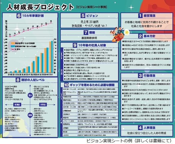 その中で、やはり10年の間に新しく得た知見であったり、10年前にはなかった課題が見えてきたりしたんですね。そこで本書の核であり、全社員が一丸となって「豊かさ」というゴールに向かっていく理想的な組織を実現するための「ビジョン実現シート」(*1)をはじめ、経営計画のレイアウト、運用ツールをリニューアルして、最も中小企業で成果の出る経営計画と評価制度を提示したのがこの本なんです。
